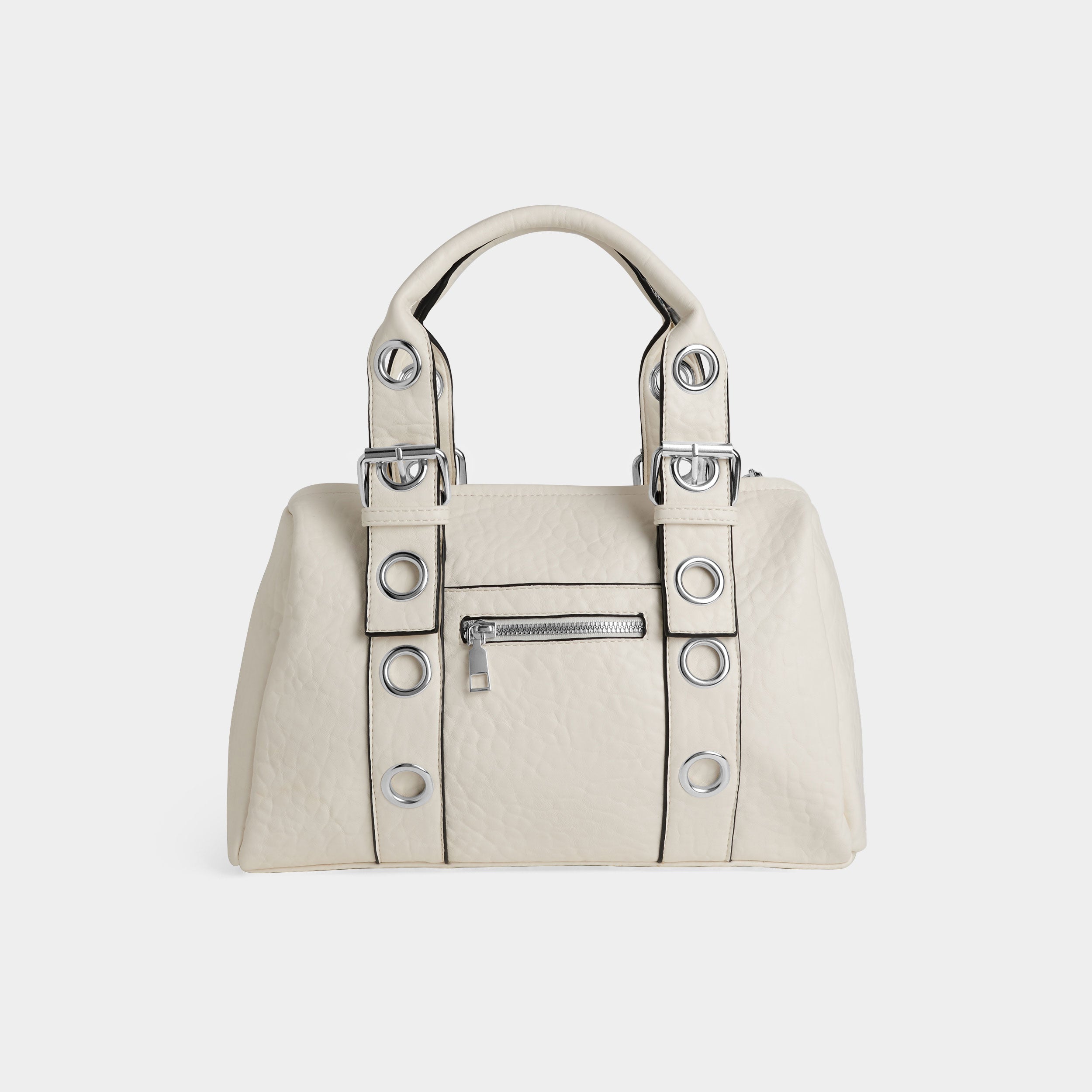 Barrel-style tote with adjustable handles. Chic grommets double as holes to lengthen the handles. Top zip reveals a spacious interior with built-in pockets for a cell phone. Zip pocket on exterior. Metal hardware. Dimensions: 12.5" W x 9.25"H x 4"D. Materials: Vegan Leather.