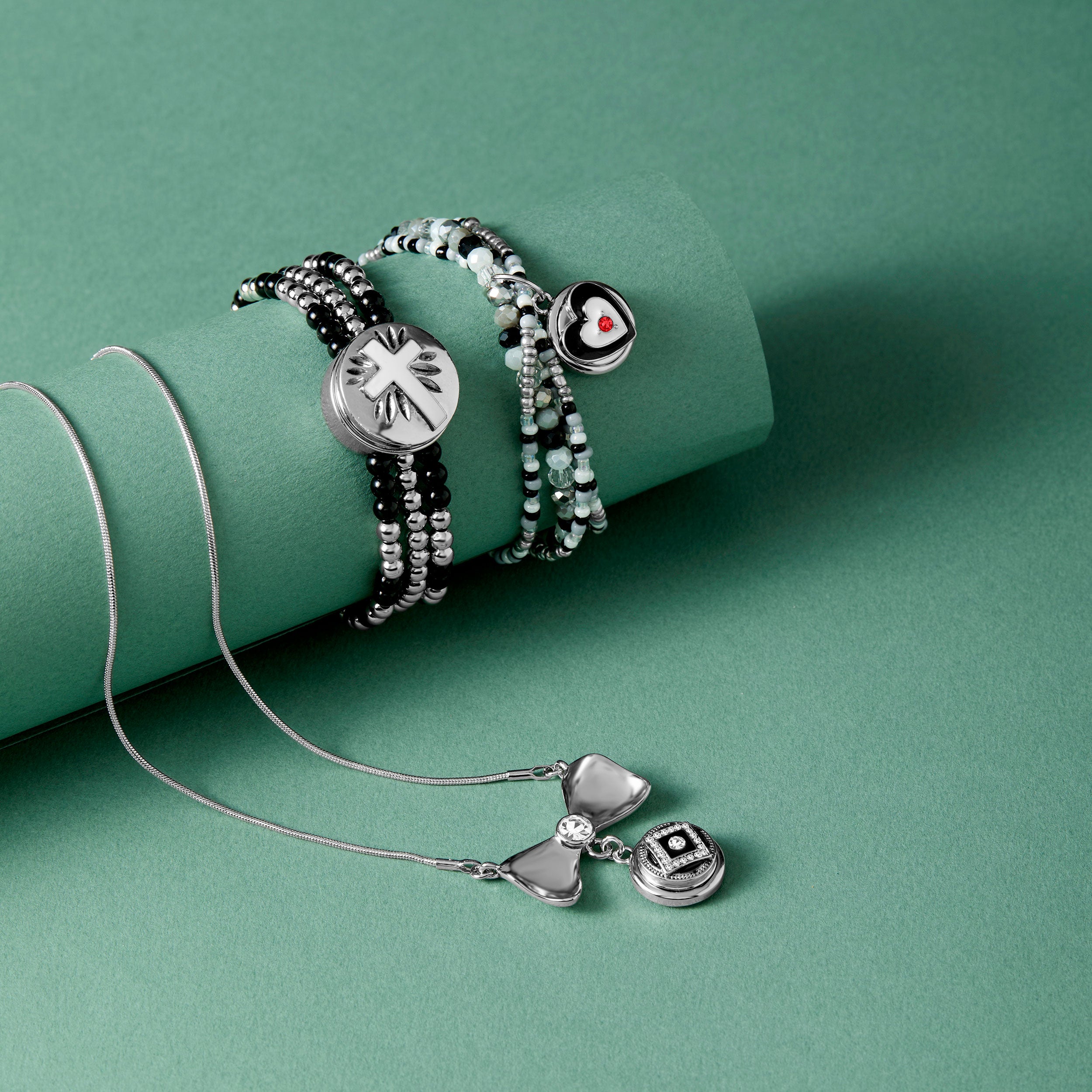 Small in size but big on style. Mix and match to create a look that's all your own. 12mm petite ginger snaps only work with 12mm petite jewelry and accessories. Stretch bracelet. Materials: Rhodium.