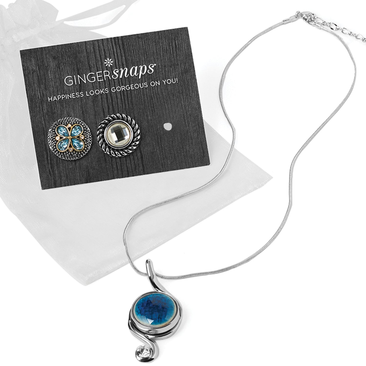 Save $5 when you buy Ginger Snaps Jewelry Sets. This Jewelry Set includes one necklace and three 20mm snap charms. Also included is a three-snap storage card and organza bag, making it perfectly giftable. Necklace measures 18-21". FINAL SALE! Please note we do not accept returns on final sale products.